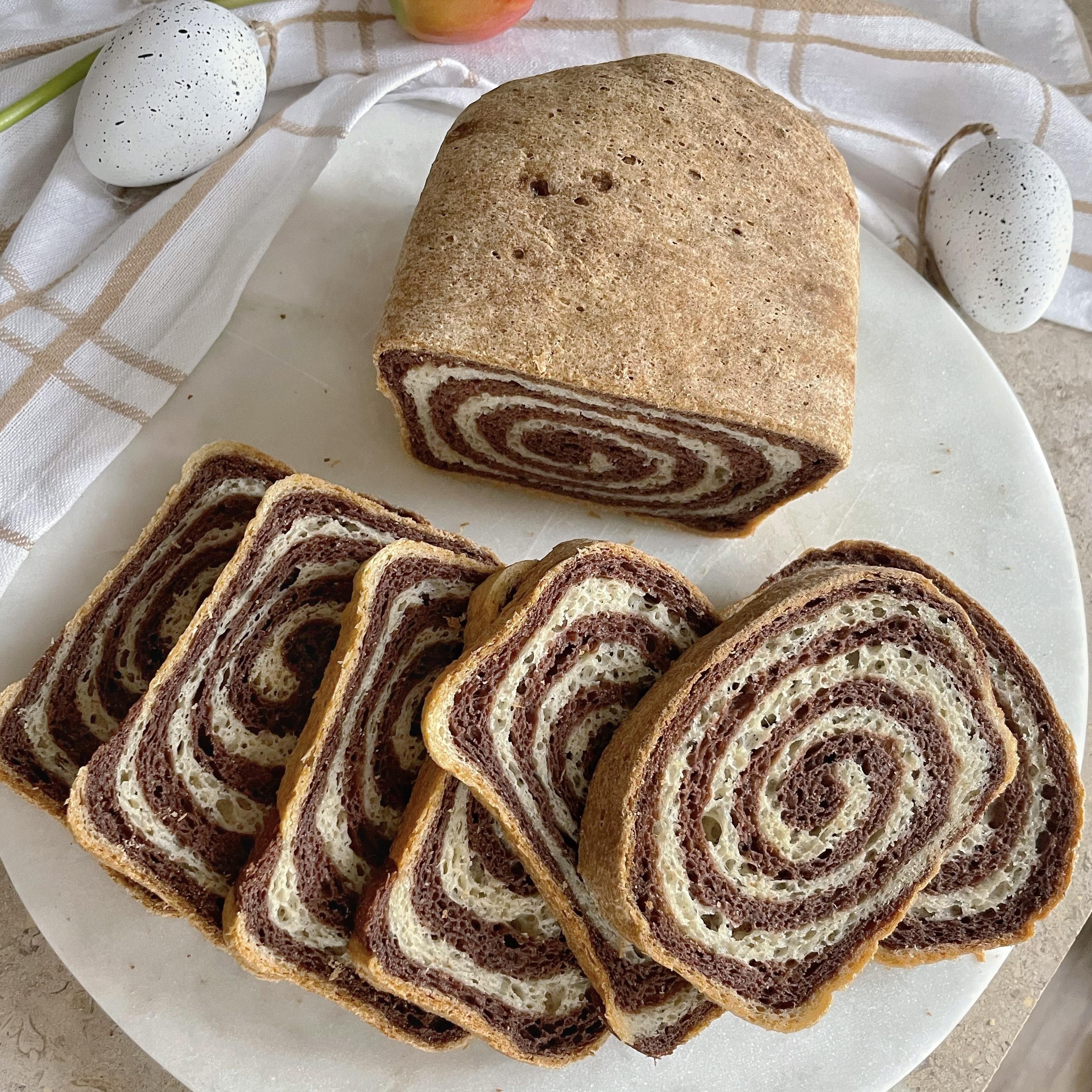 Egy kanállal keverjük a tésztát, amíg rugalmas nem lesz, majd pihentessük 15 percig. Enyhén lisztezett felületen gyúrjuk át, nyújtsuk 3 mm vastag téglalap alakúra mindkét részt. Helyezzük egymásra a sima és kakaós tésztát, tekerjük fel, igazítsuk meg.